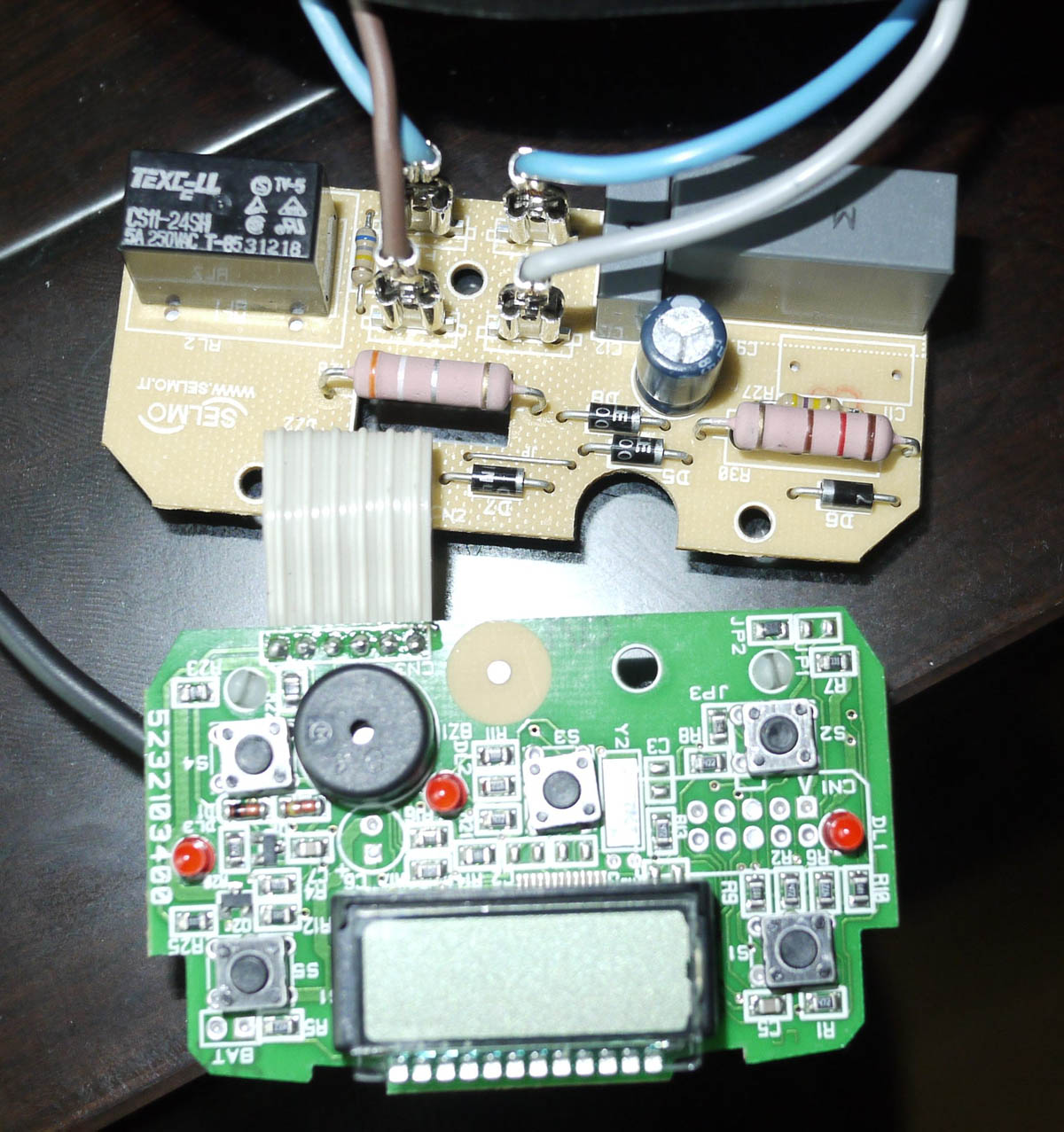In the base of the unit, there are two circuit boards connected to each other by a ribbon cable. The power supply is on one board and the microcontroller circuit with the display and push buttons on the other. A quick inspection showed one electrolytic capacitor which does not seem to be swollen at the top or leaking, although that does not necessarily mean it is in good condition, but at least it is not a certain, obvious cause.